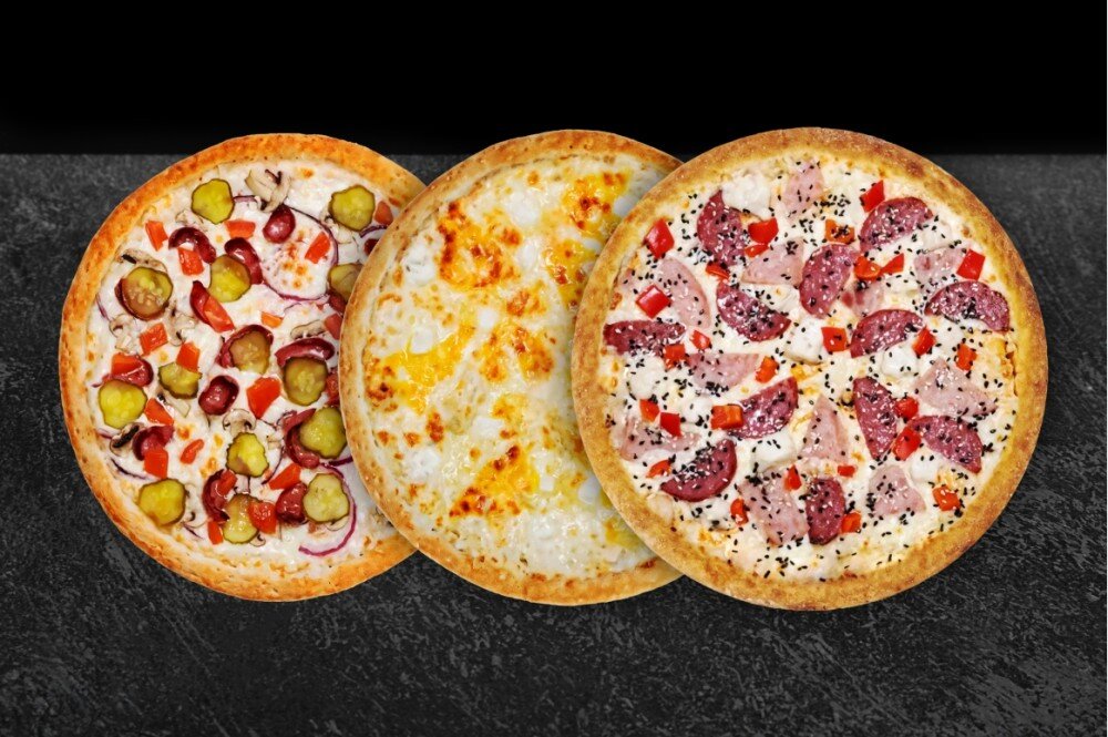 Состав: Пицца 4 Сыра, Пицца Охотничья, Пицца Бургер.