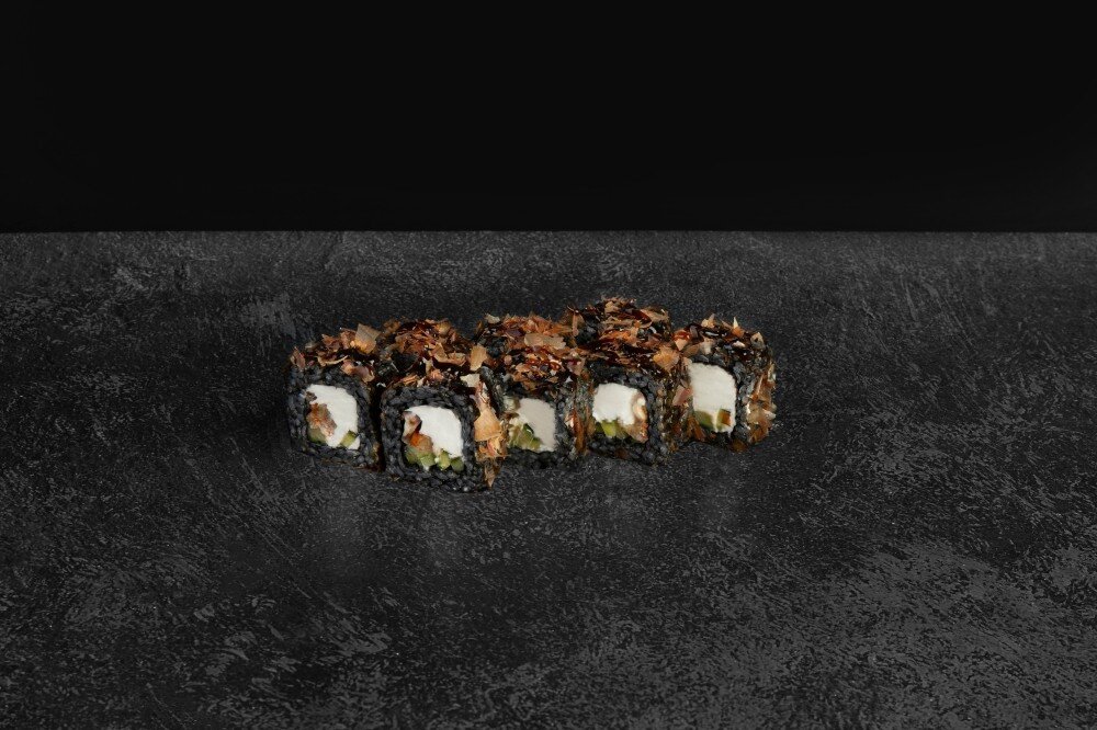 Состав: Рис черный, нори, угорь, огурец, сыр творожный, стружка тунца, соус унаги. В комплекте: имбирь-1 шт, васаби-1шт, соевый соус-1 шт.