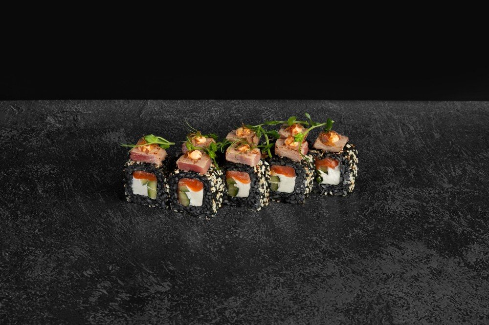 Состав: Рис черный, нори, сыр творожный, огурец, лосось, тунец, кунжут, спайси соус, микрозелень. В комплекте: имбирь-1 шт, васаби-1шт, соевый соус-1 шт.