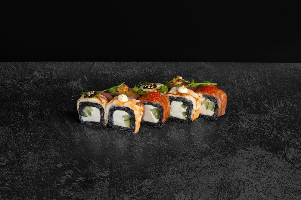 Состав: Рис черный, нори, сыр творожный, огурец, креветки, лосось, тунец, угорь, икра масаго, соус унаги, спайси соус, чесночный соус, микрозелень. В комплекте: имбирь-1 шт, васаби-1шт, соевый соус-1 шт.