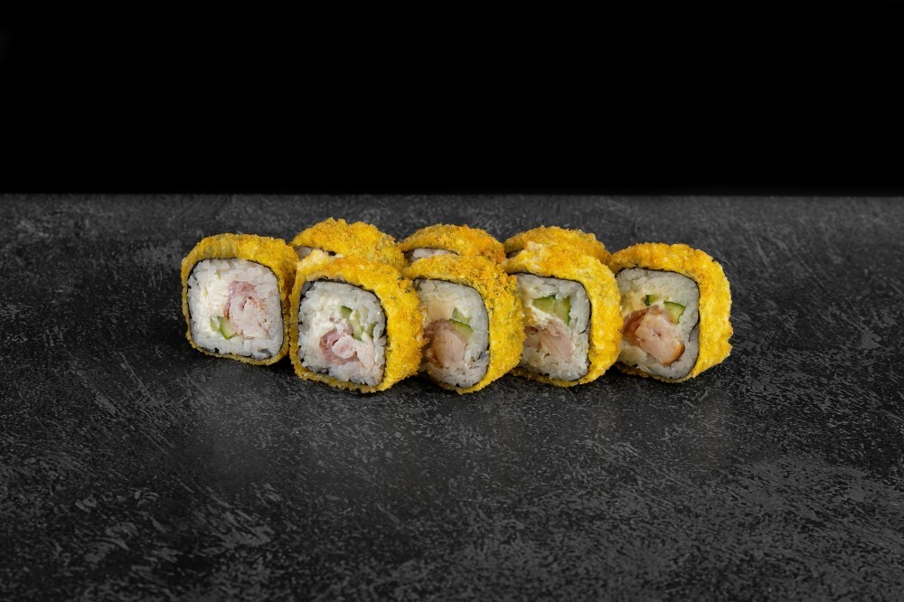 Состав: нори, рис, бекон, курица х/к, сыр творожный, огурец. В комплекте: имбирь-1 шт, васаби-1 шт, соевый соус-1 шт.