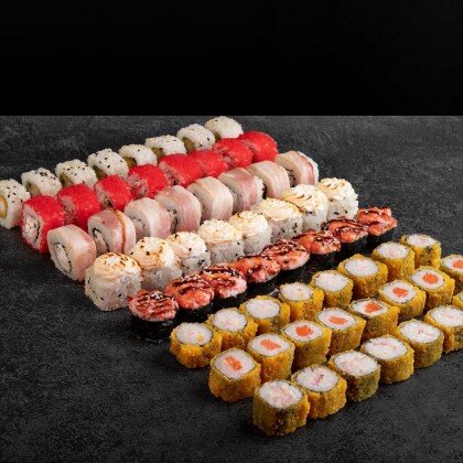 Состав: Калифорния в кунжуте, Запеченный с курицей, Фреш-ролл с курицей, Филадельфия, Рио. В комплекте: Имбирь-3 шт; Васаби-3 шт; Соевый соус-3 шт.