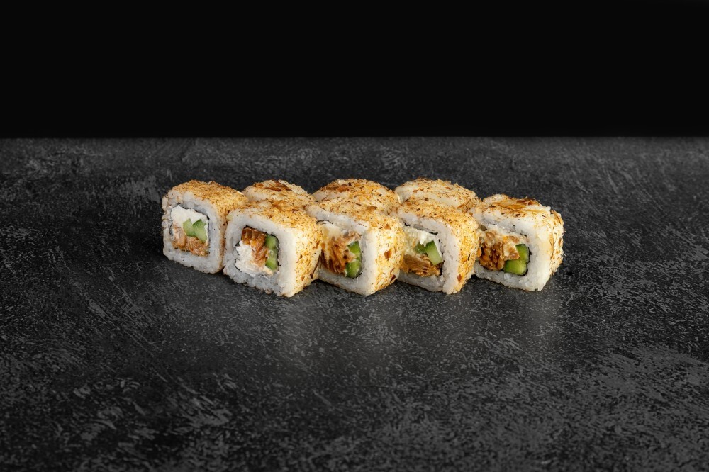 Состав: рис, нори, жареный лосось, огурец, сыр творожный, стружка тунца. В комплекте: имбирь-1 шт, васаби-1шт, соевый соус-1 шт.