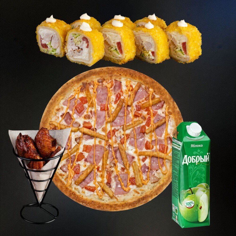 Состав: Фреш ролл с курицей, крылья Баффало-6шт, пицца Домашняя, сок Добрый 1 л.