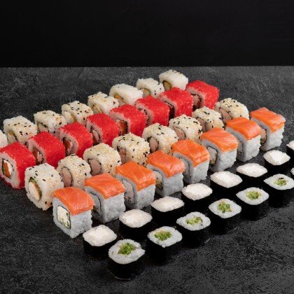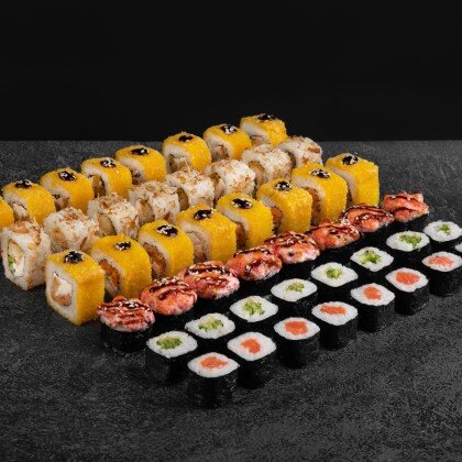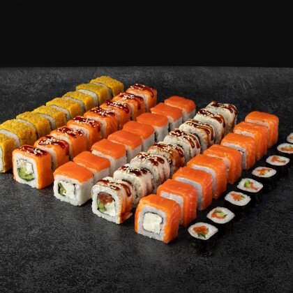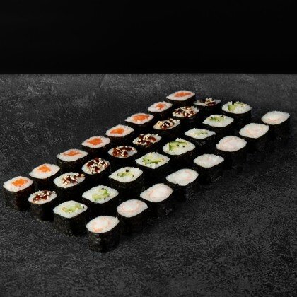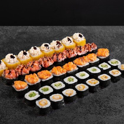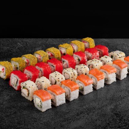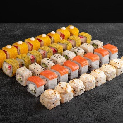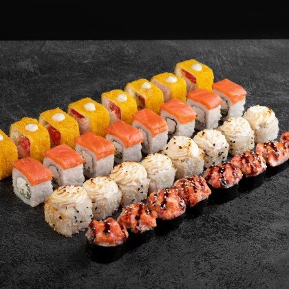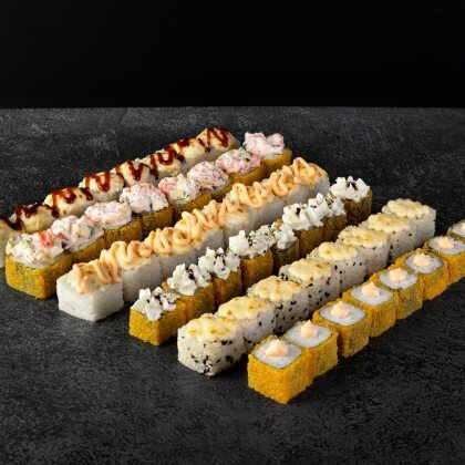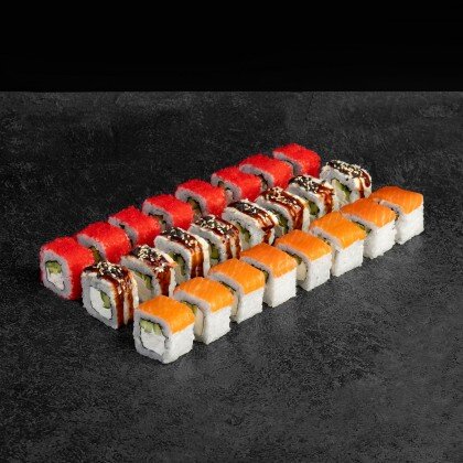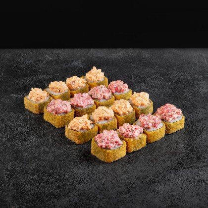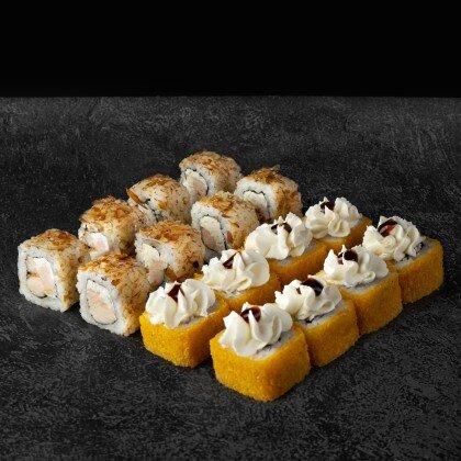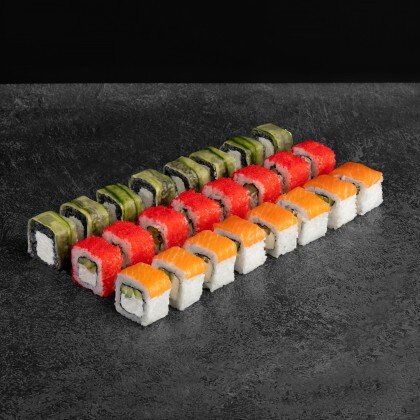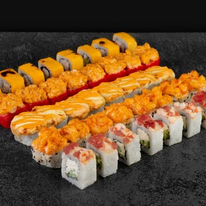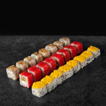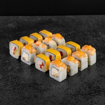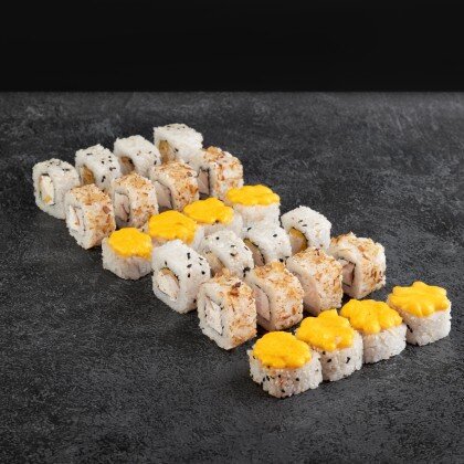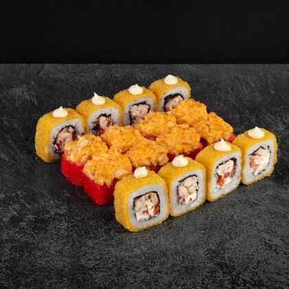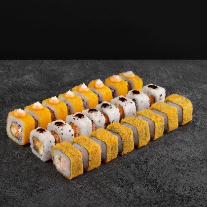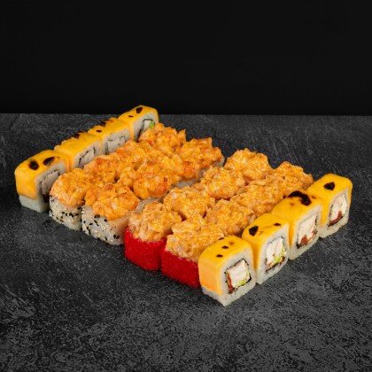 Состав: Запеченный Фристайл, Оригинальный ролл Спайси лосось, Классический ролл с огурцом, Чикен темпурный. В комплекте: Имбирь-2 шт, васаби- 2 шт, соевый соус-2 шт.