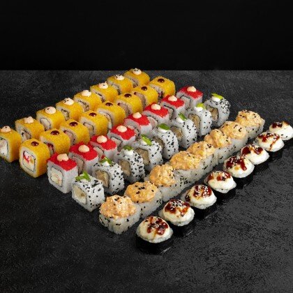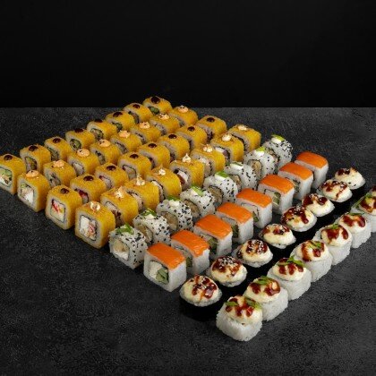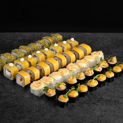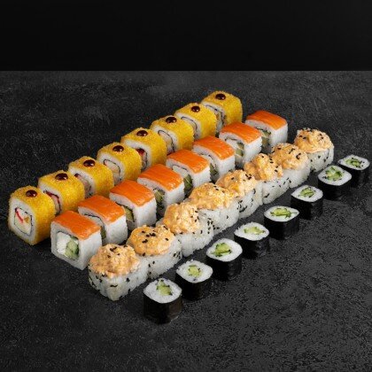 Состав: Банзай, Запеченный Голд, Темпурный ролл Веган, Хот-фиш, Калифорния в кунжуте. В комплекте: имбирь-3 шт, васаби-3 шт, соевый соус-3 шт.