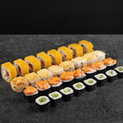 Состав: Тай темпура, Хот фиш, Галактика, Люкс с лососем, Классический ролл с огурцом, Запеченный с крабом. В комплекте: имбирь - 3 шт., васаби - 3 шт., соевый соус - 3 шт.