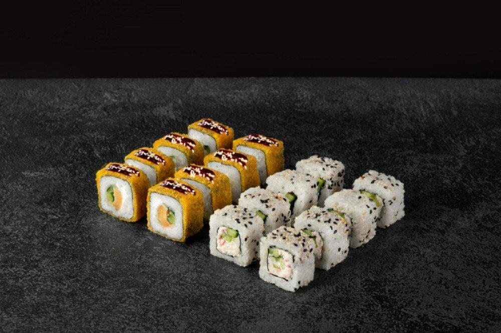 Состав: Калифорния в кунжуте, темпурный ролл томаго.В комплекте: Соевый соус-1 шт, имбирь-1 шт, васаби-1 шт.