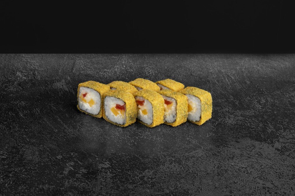 Состав: Рис, нори, сыр творожный, сыр гауда, сыр моцарелла, сыр пластинка, томат. В комплекте: имбирь-1 шт, васаби-1шт, соевый соус-1 шт.