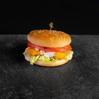 Состав: Нежная булочка, котлета куриная, пекинская капуста, томат, огурец свежий, сыр чеддер, соус бургерный.