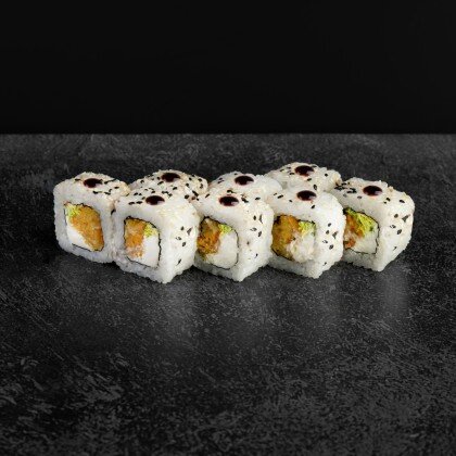 Состав: рис, нори, сыр творожный, огурец, лосось В комплекте: имбирь-1 шт, васаби-1шт, соевый соус-1 шт.
