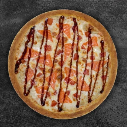 Состав: Тесто, бургерный соус, сыр моцарелла, ветчина, курица, перец болгарский, сервелат, кунжутный микс.
