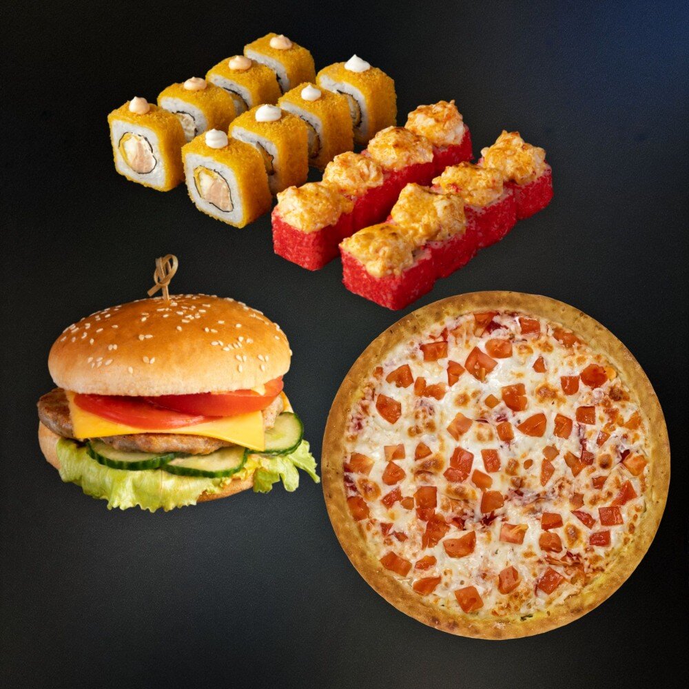 Состав: Сет Лакомый, пицца Маргарита, Чикен бургер. В комплекте: имбирь-1 шт, васаби-1шт, соевый соус-1 шт.
