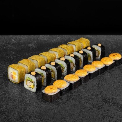 Состав: Запеченный Пикник, Запеченный Голд, Оригинальный ролл Макс, Оригинальный ролл Эймон, Темпурный ролл Локи, Темпурный ролл Кастер. В комплекте: имбирь-3шт, васаби-3шт, соевый соус-3 шт.