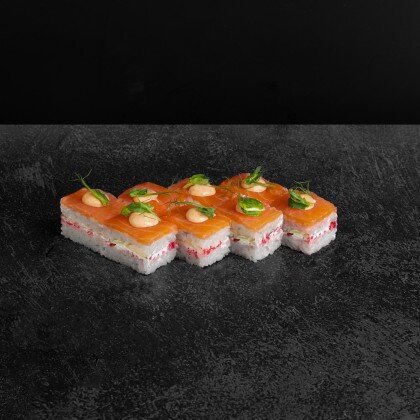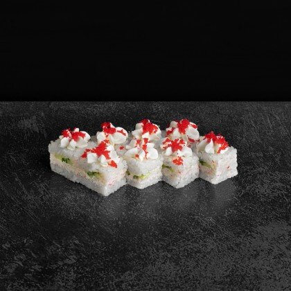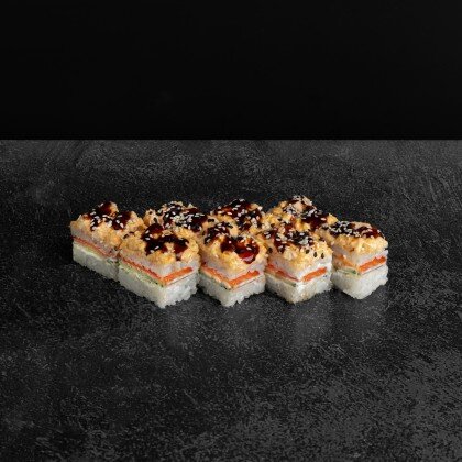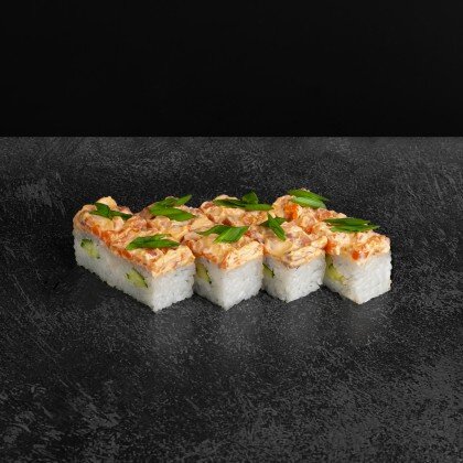 Состав: рис, нори, креветки, соус спайси, лук зеленый. В комплекте: имбирь-1 шт, васаби-1 шт, соевый соус-1 шт.