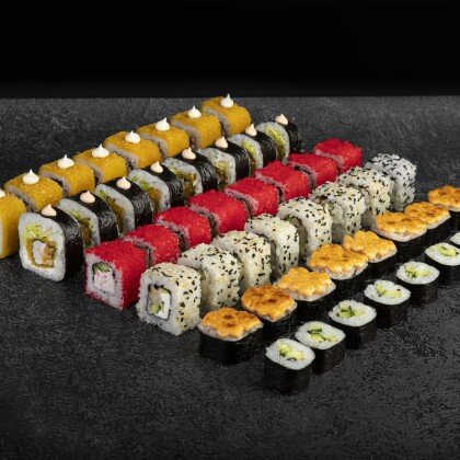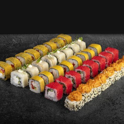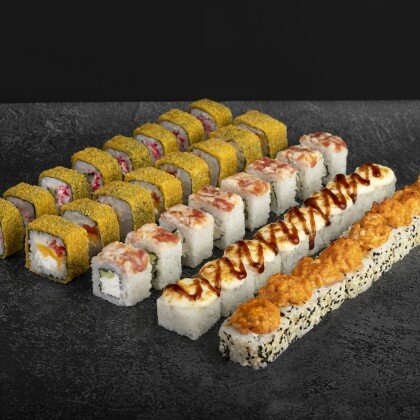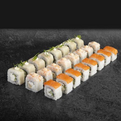 Состав: Темпурный Хил, Темпурный Каста, Пикантная креветка, Запеченный с курицей, Валет В комплекте: имбирь-3 шт, васаби-3 шт, соевый соус-3 шт.
