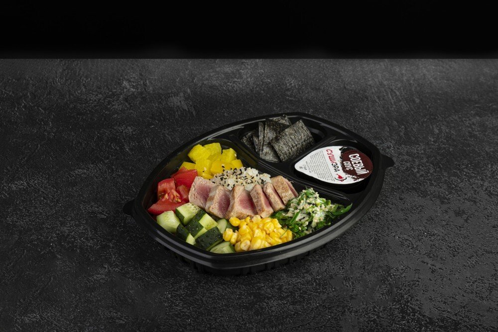 Состав: рис, нори, тунец обжаренный, такуан, томат, огурец, чука, кукуруза, кунжут, соус ореховый.