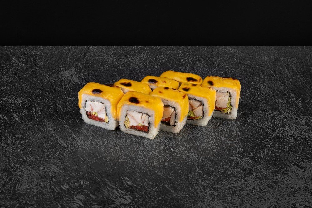 Состав: рис, нори, курица х/к, томат, пекинская капуста, сыр чеддер. В комплекте: имбирь-1 шт, васаби-1шт, соевый соус-1 шт.