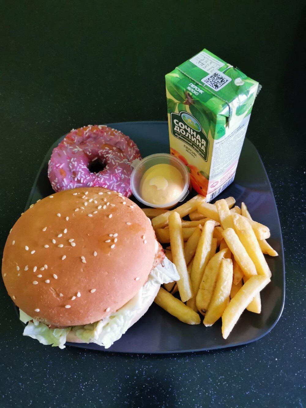 Состав: Картофель фри, Чикен бургер, Сок 0,2л, Донатс клубничный с начинкой, Соус на выбор.