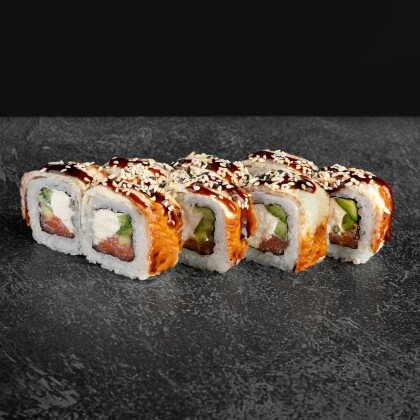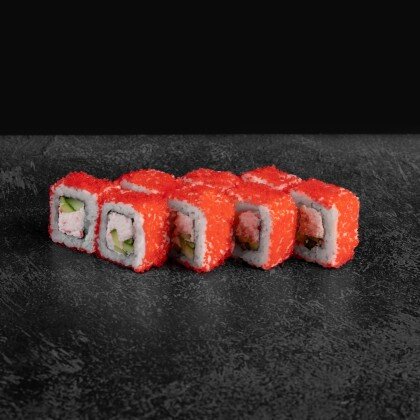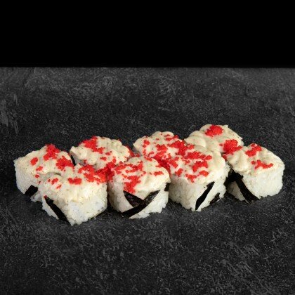 Состав: нори, рис, сыр творожный, лосось, икра масаго, томаго. В комплекте: имбирь-1 шт, васаби-1шт, соевый соус-1 шт.