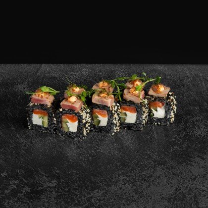 Состав: Рис черный, нори, краб(имитация), лосось, огурец, кунжут. В комплекте: имбирь-1 шт, васаби-1шт, соевый соус-1 шт.