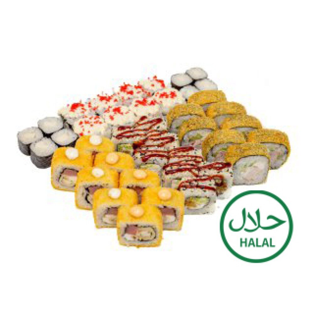 Состав: Ролл Тунец, Классический ролл с копченным кальмаром, Унаги Хот, Ролл Халяль, Жареный Изуми. В комплекте: Имбирь-3шт, Васаби-3шт, Соевый соус-3шт.