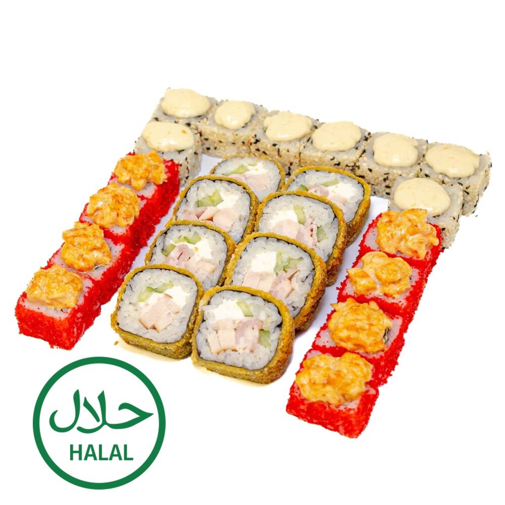 Состав:Ролл Халяль, Запеченный с угрем, Спайси креветка. В комплекте: Имбирь-2шт, Васаби-2шт, Соевый соус-2шт.