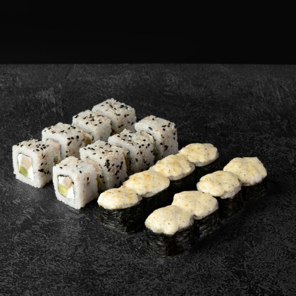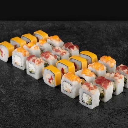 Состав: Жареный Япошка, Запеченный Фристайл, Ролл Тунец, Цезарь. В комплекте: Имбирь-2 шт, Васаби-2 шт,Соевый соус-2 шт.