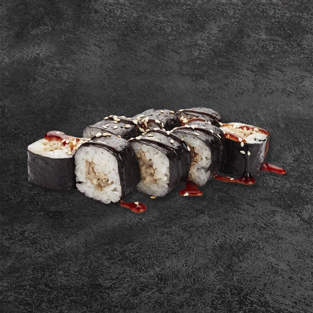 Состав: рис, нори, угорь, соус унаги, кунжут. В комплекте: имбирь-1 шт, васаби-1шт, соевый соус-1 шт.