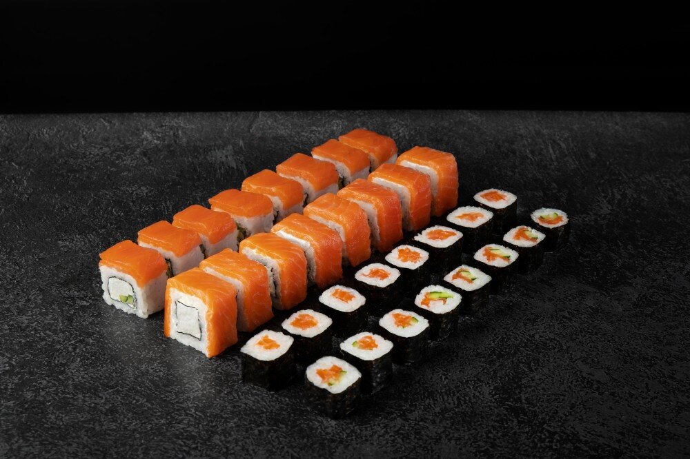 Состав: Филадельфия Лайт, Филадельфия , Ролл с лососем, Ролл с лососем и огурцом. В комплекте: Имбирь-2 шт; Васаби-2 шт; Соевый соус-2 шт.
