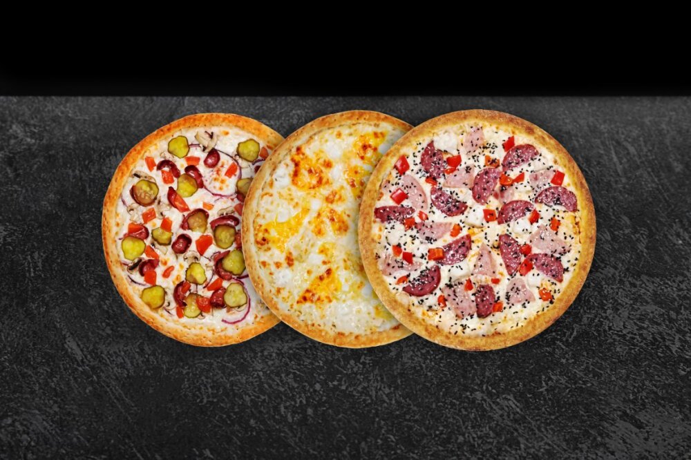 Состав: Пицца 4 Сыра, Пицца Охотничья, Пицца Бургер.