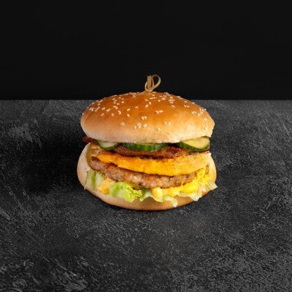 Состав: Нежная булочка, мясная котлета, хрустящий салат, томаты, соус биг тейсти, сыр.