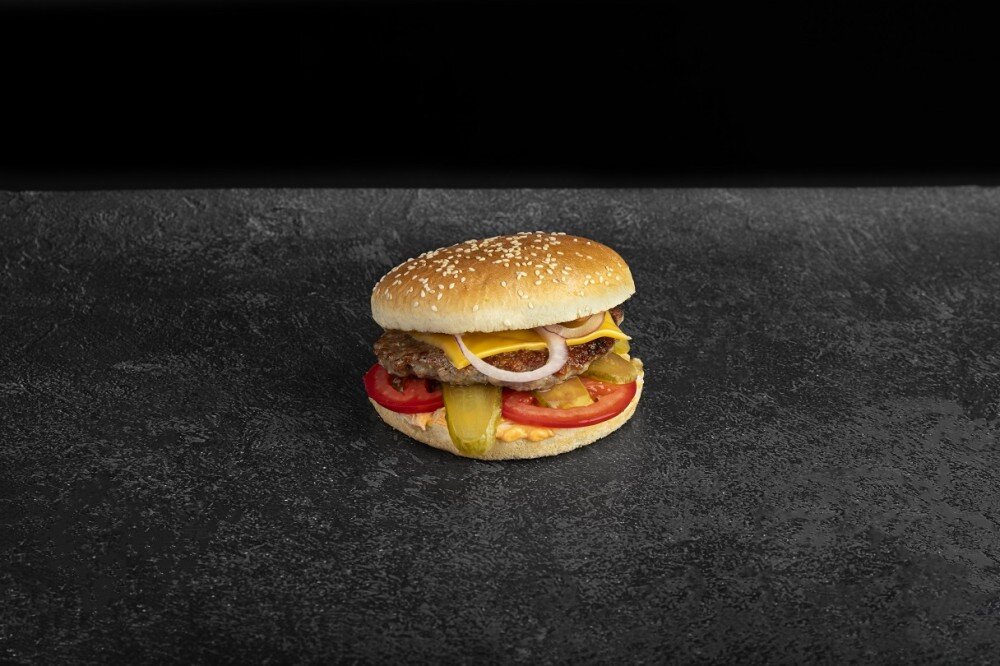 Состав: Нежная булочка, котлета говяжья, томат, огурец соленый, лук красный, сыр пластинками, соус бургерный, салат айсберг.