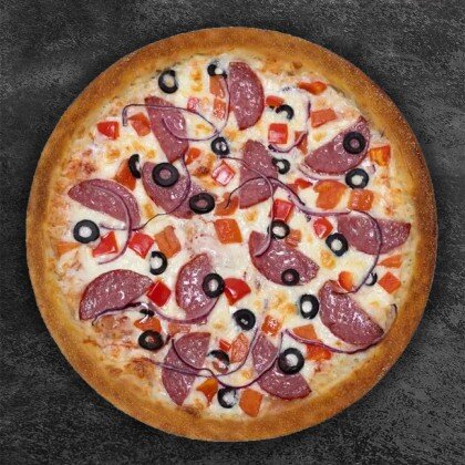 Состав: Тесто, соус сливочный, сыр моцарелла, ветчина, бекон, томат, картофель фри, соус бургерный.