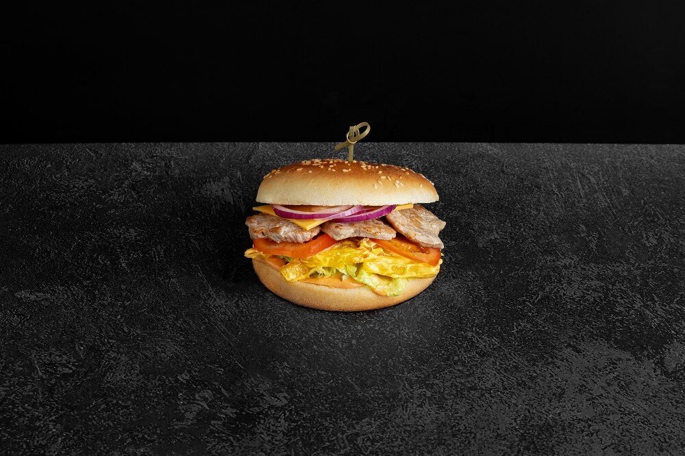 Состав: Нежная булочка, свинина жареная, сыр пластинками, томат, салат айсберг, лук красный, картофель фри, соус сырный, соус бургерный.