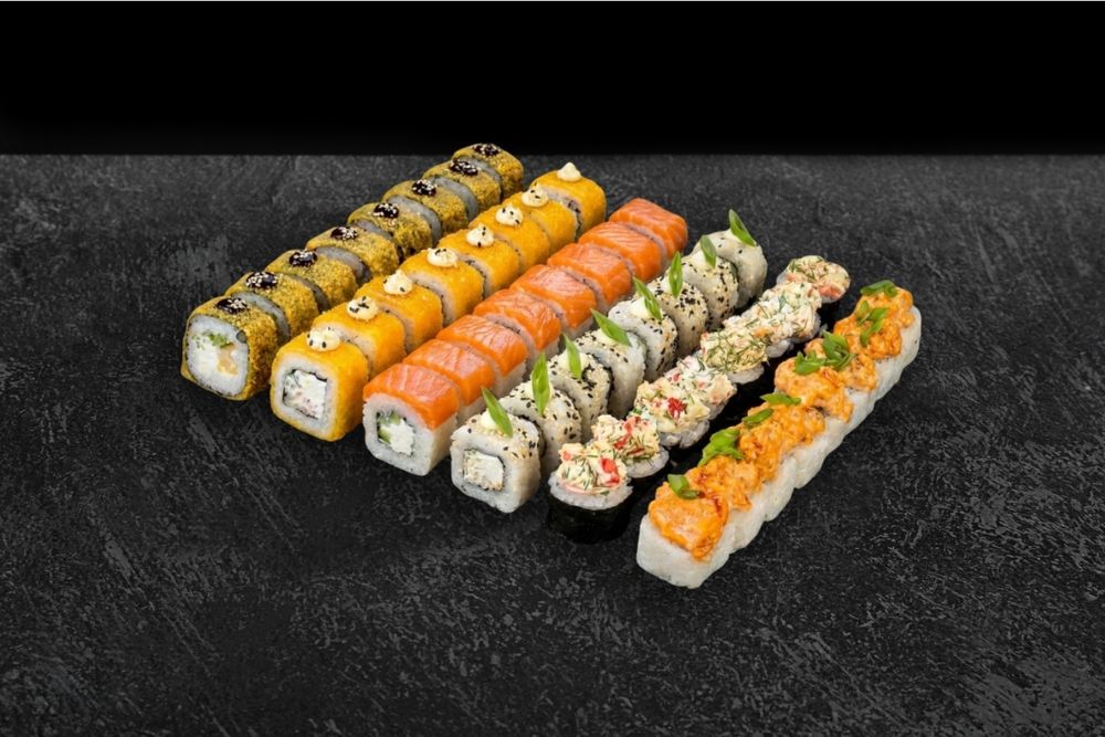 Темпурный томаго, Темпурный ролл Локи, Запеченный с окунем, Запеченный Каскад, Филадельфия, Эймон. В комплекте: имбирь-3 шт, васаби-3 шт, соевый соус-3 шт.