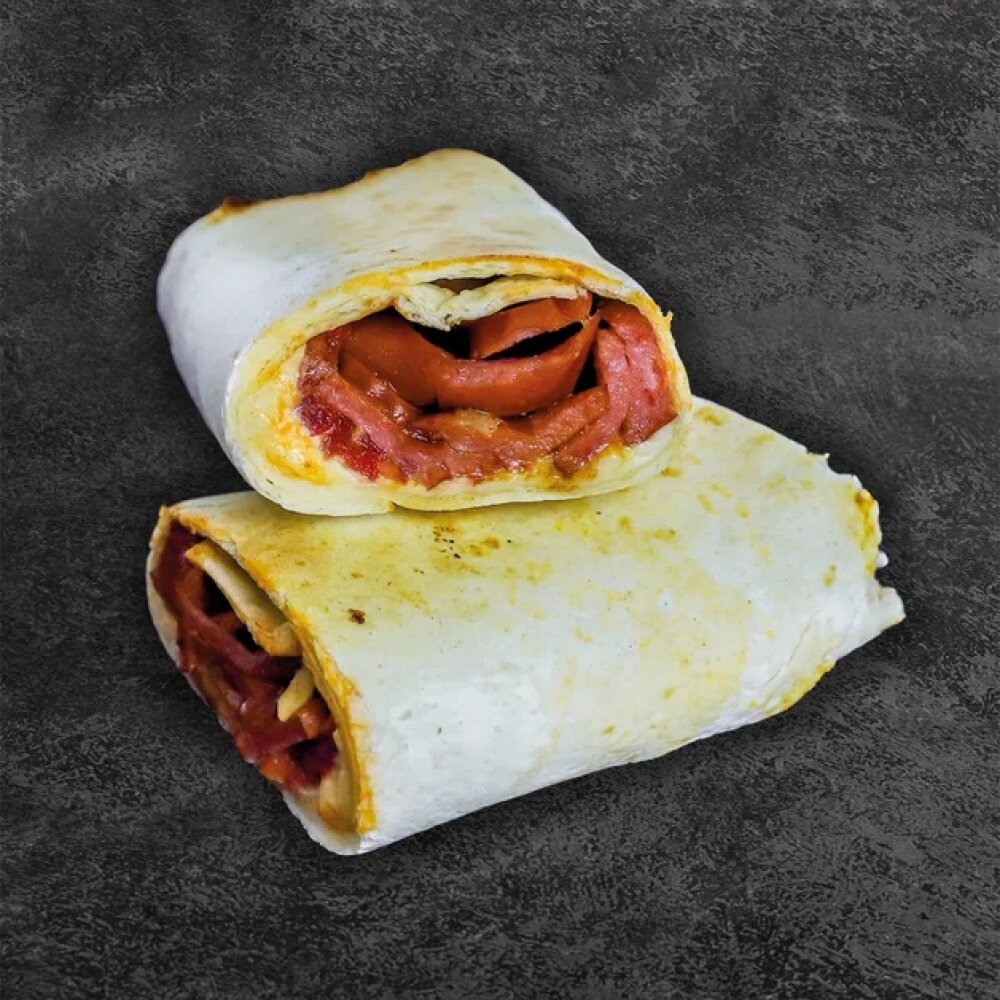 Состав: Тортилья, охотничья колбаска, томат, сыр творожный, соус чесночный, соус барбекю.
