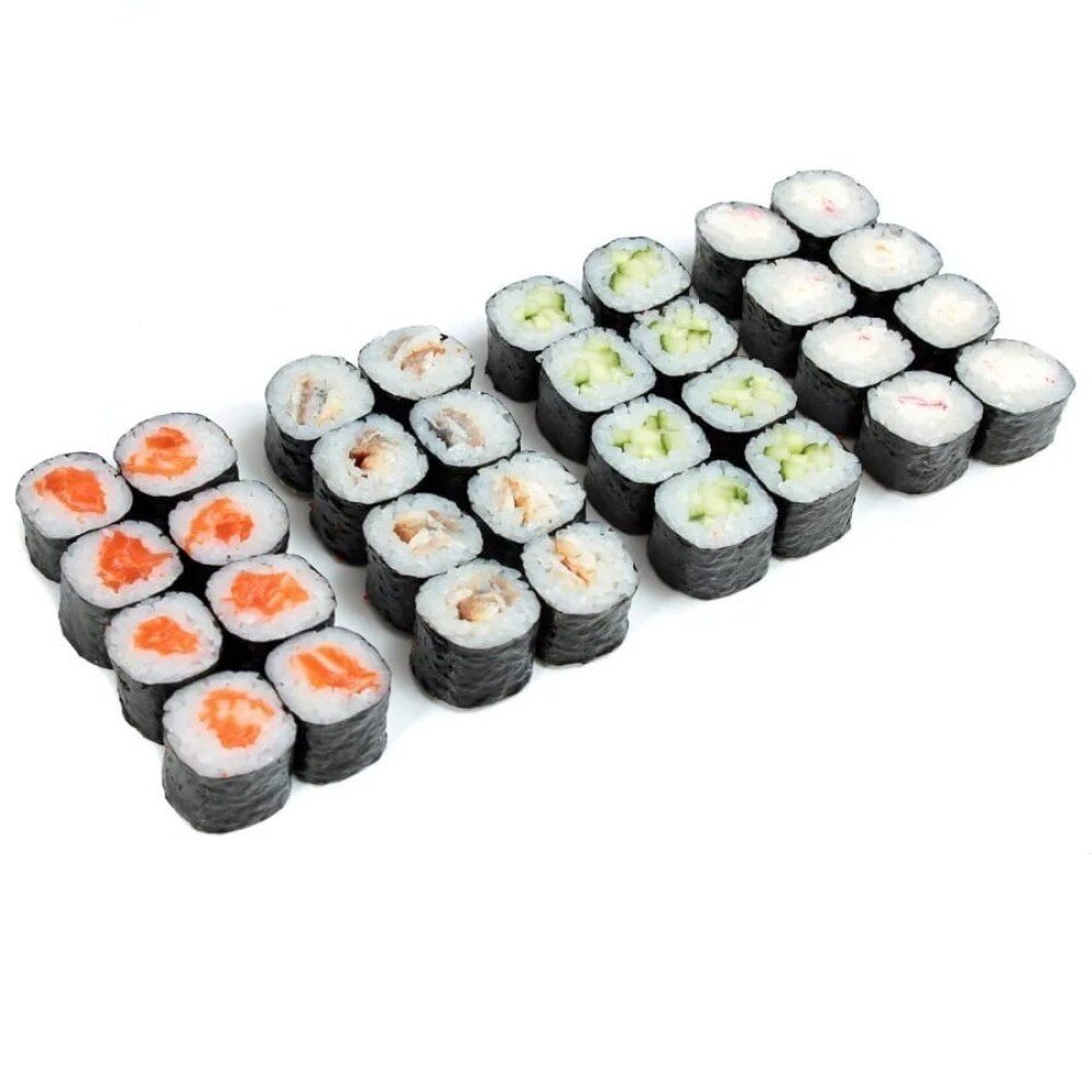 Классический ролл с огурцом, классический ролл с лососем, классический ролл с креветкой, классический ролл с угрем. В комплекте: Имбирь-2 шт, васаби-2 шт, соевый соус-2 шт.