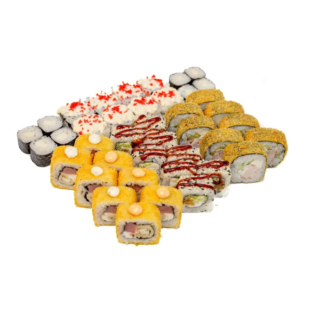 Ролл Тунец, Классический ролл с копченным кальмаром, Унаги Хот, Дон Бекон, Жареный Изуми. В комплекте: Имбирь-3шт, Васаби-3шт, Соевый соус-3шт.