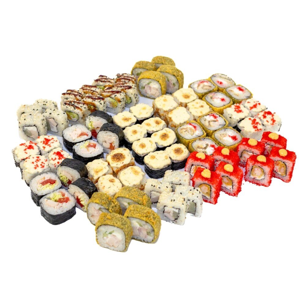 Дон Бекон, Угорь темпурный, Запеченный с креветками, Запеченный Хруст, Унаги Хот, Калифорния с окунем, Ролл Тунец, Гавайский, цезарь. В комплекте: Имбирь-5шт, Васаби -5шт, Соевый соус-5шт.