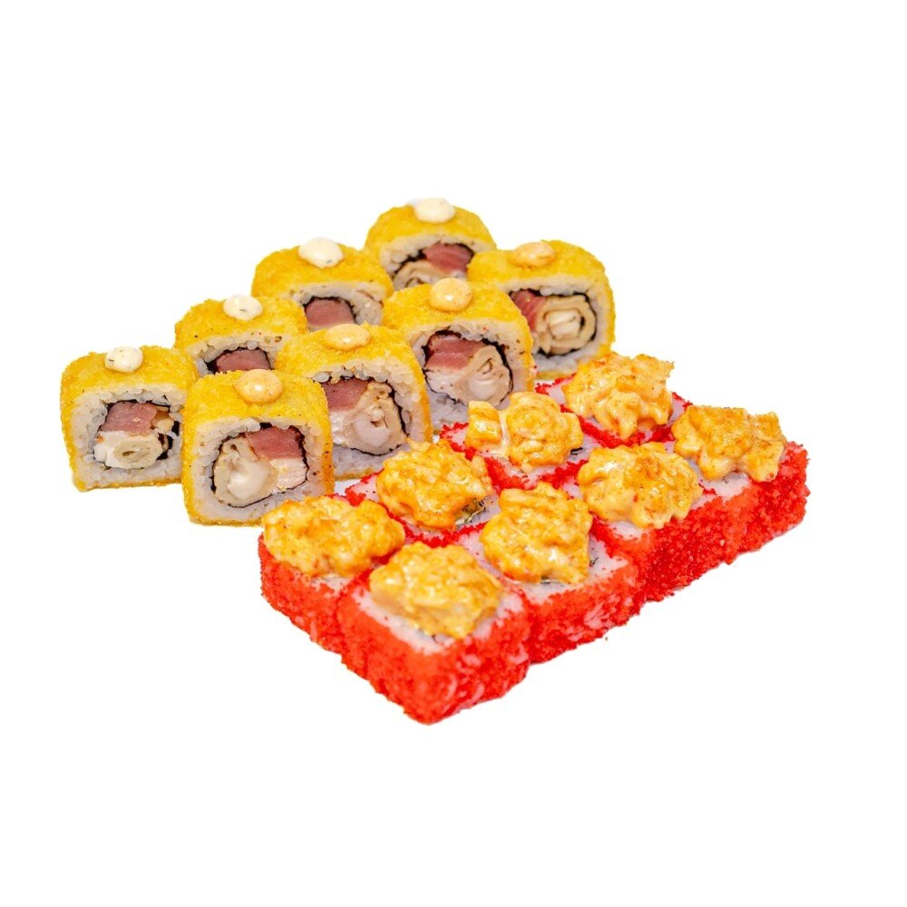 Жареный Изуми, Запеченный спайси-креветка. В комплекте: Имбирь-1шт, Васаби-1шт, Соевый соус-1шт.