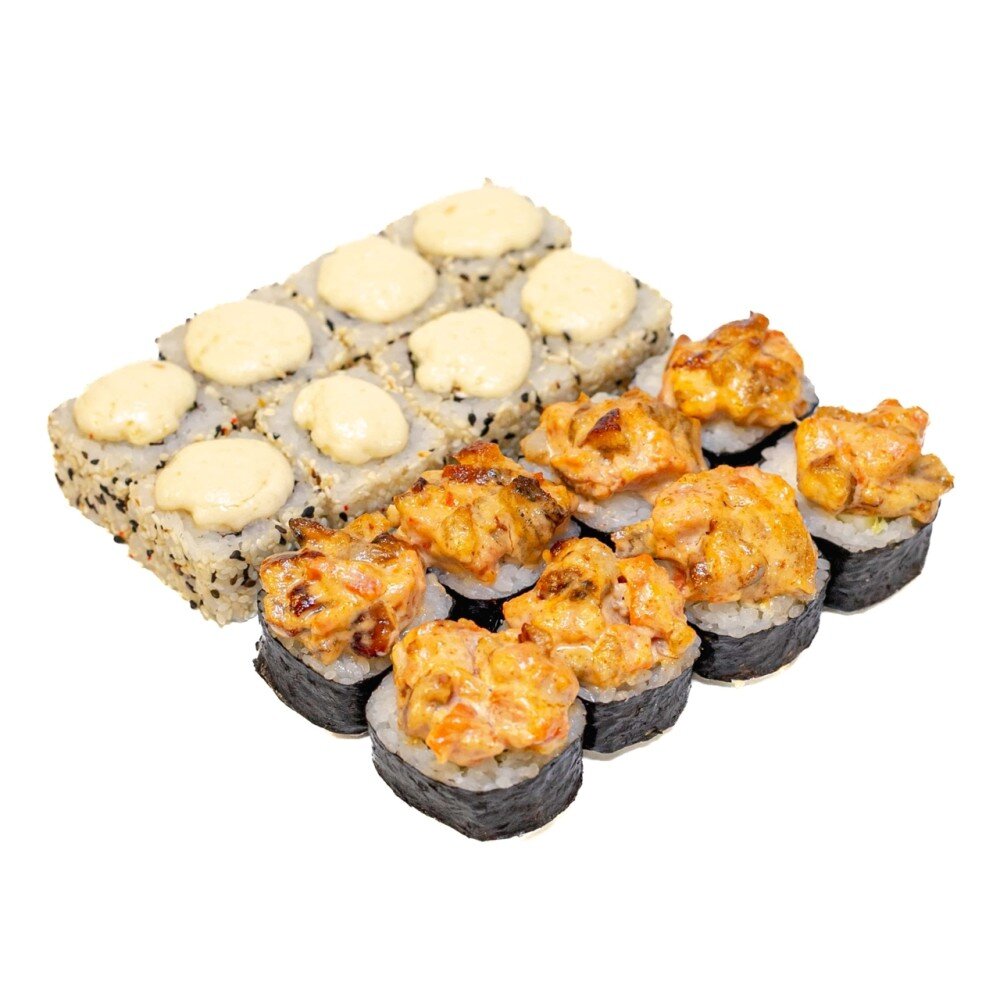 Запеченный Фиш, Запеченный с угрем. В комплекте: Имбирь-1шт, Васаби-1шт, Соевый соус-1шт.