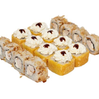 Угорь темпурный, Феникс, Запеченный спайси-креветка. В комплекте: Имбирь-2шт, Васаби-2шт, Соевый соус-2шт
