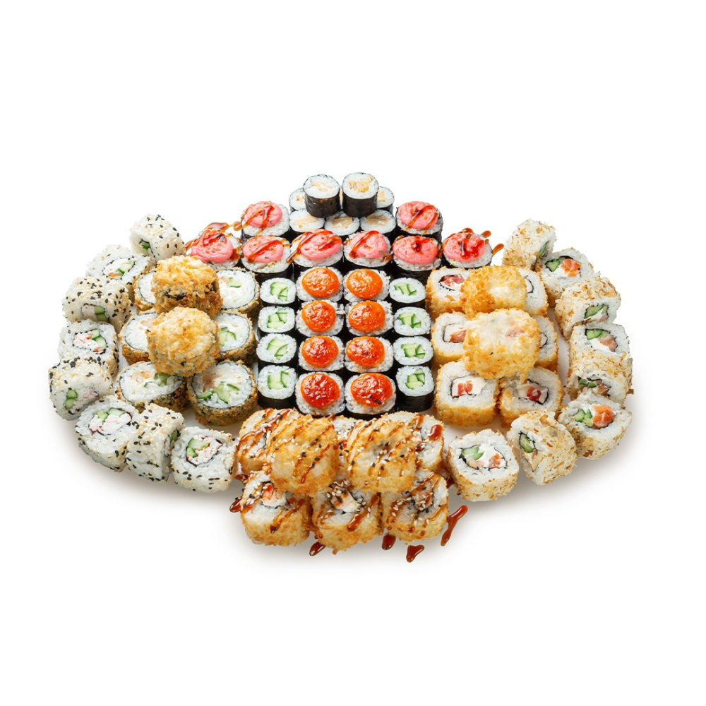 Запечённый Чили-вили, Запечённый с крабом, Хот-фиш, Аризона, Чикен темпура, Галактика, Калифорния в кунжуте, ролл Классический с томаго, Ролл классический с огурцом. В комплекте: Имбирь-5 шт; Васаби-5 шт; Соевый соус-5 шт.