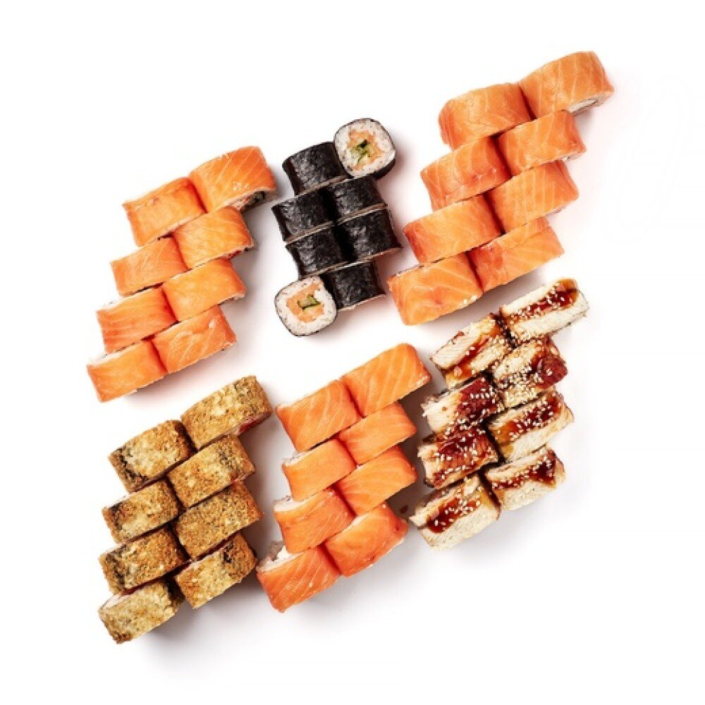 Филадельфия люкс, Филадельфия лайт, Филадельфия, Канада, Филадельфия хот, Ролл с лососем и огурцом. В комплекте: Имбирь-4 шт; Васаби-4 шт; Соевый соус-4 шт.