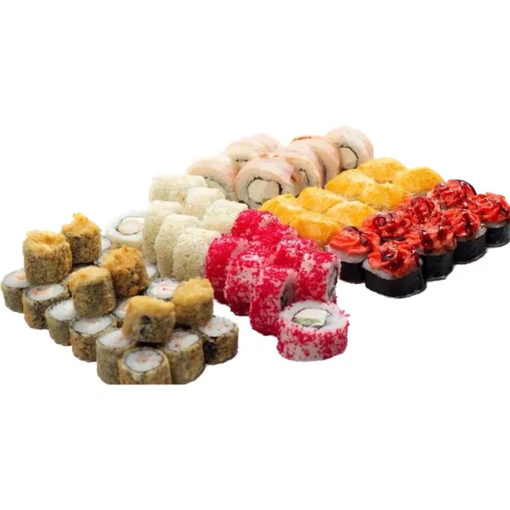 Эби ролл, Калифорния, Мясной, Темпурная классика с беконом, Темпурная классика с крабом, Темпурная классика с лососем, Запеченный с крабом, Запеченный с курицей. В комплекте: Имбирь-4 шт; Васаби-4 шт; Соевый соус-4 шт.