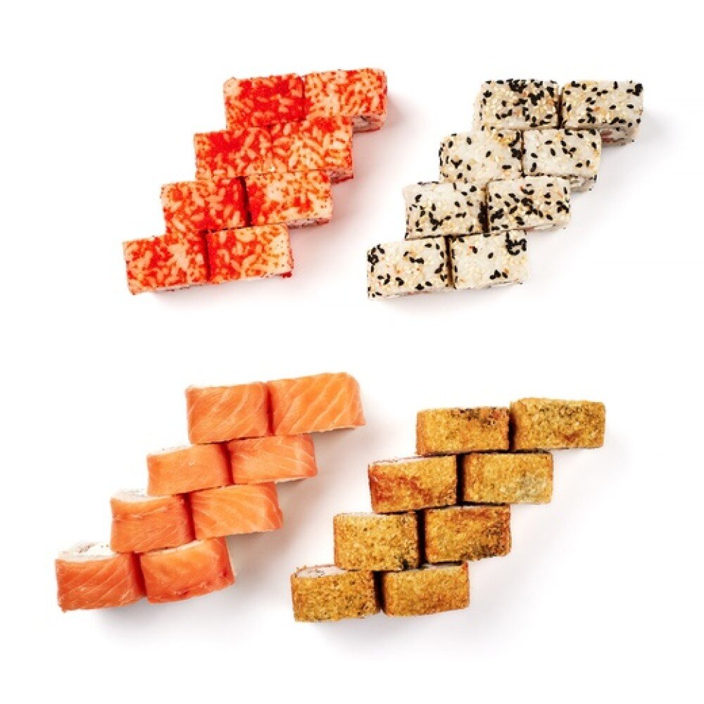 Филадельфия ,Чикен ролл, Калифорния, Рио. В комплекте: Имбирь-2 шт; Васаби-2 шт; Соевый соус-2 шт.