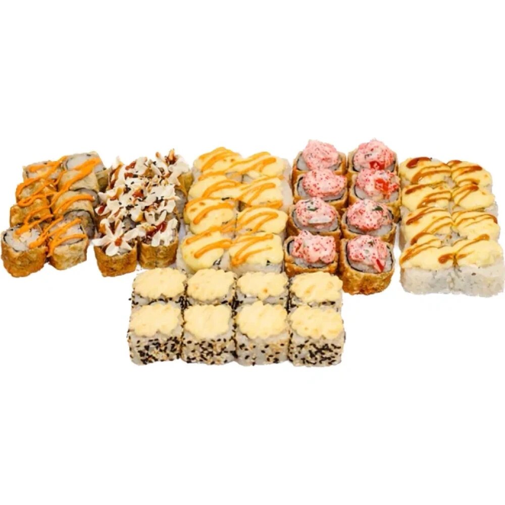 Темпурная классика с крабом,Темпурная классика с курицей, Запеченный соблазн, Запеченный цыпленок, темпурный ролл Веган, Запеченный фристайл. В комплекте: Имбирь-3 шт; Васаби-3 шт; Соевый соус-3 шт.