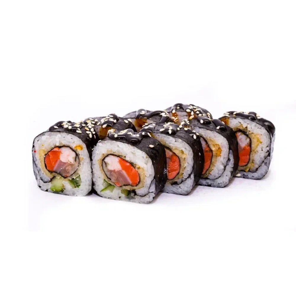 Состав: нори, рис, майонез, тунец, окунь, креветки, лосось, огурец, темпура, унаги, кунжут