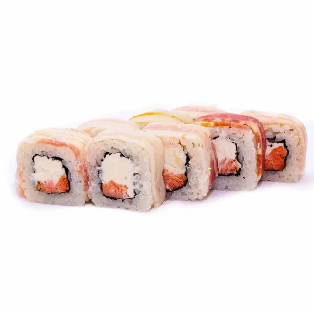 Состав: рис, нори, бекон, сыр творожный, лосось жареный.